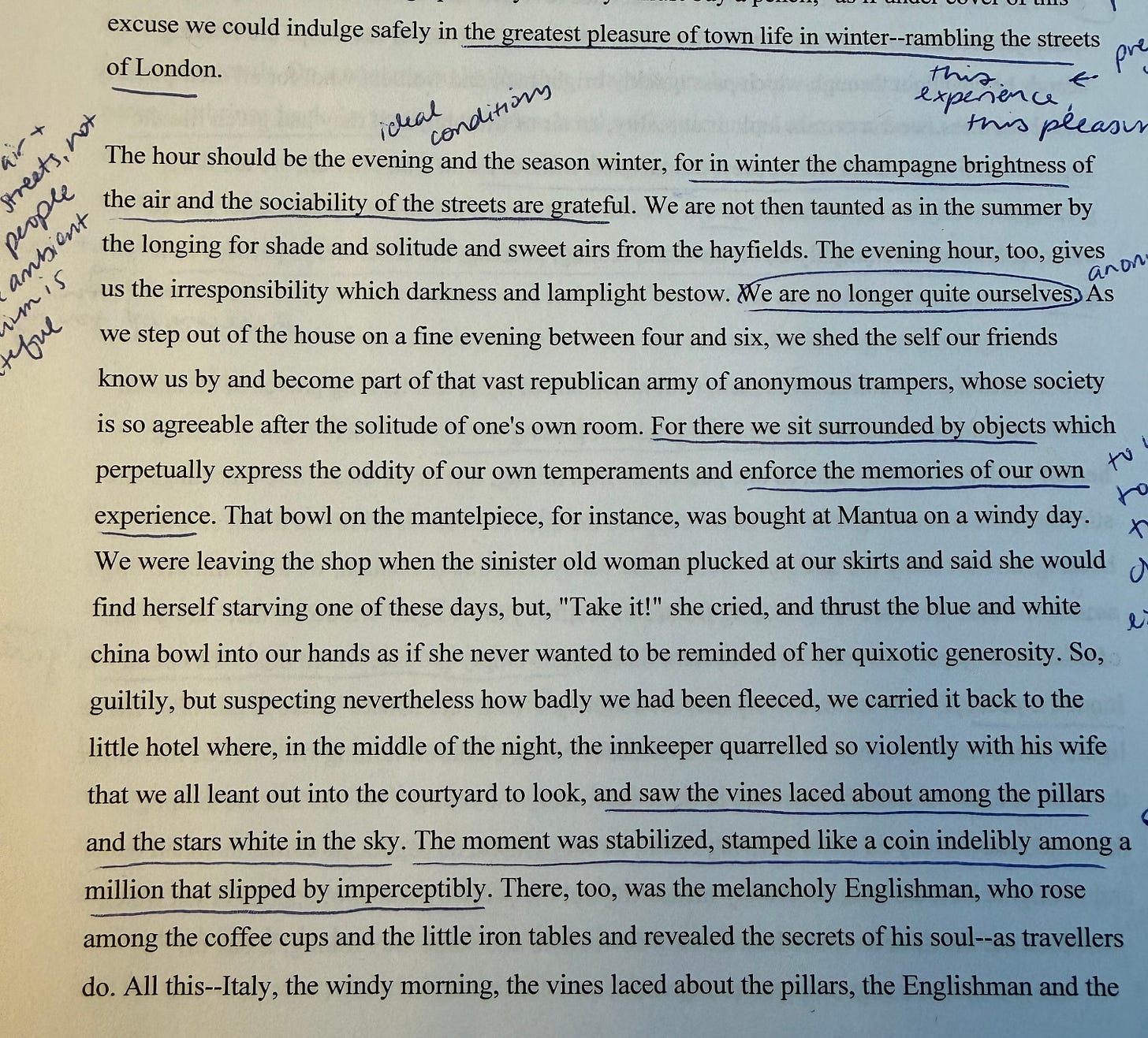 I’m TA’ing an English class that I also TA’d two years ago. This week we read the essay “Street Haunting” by Virginia Woolf, which was one of my favorites last time. And it’s wild to see how many threads of that piece have permanently made their way into my psyche! Every time I read Woolf, I can feel my work bloom. I feel a renewed faith that writing really can hold it all. James Wood, who’s the professor for this course, said Woolf is a writer more interested in image than idea.